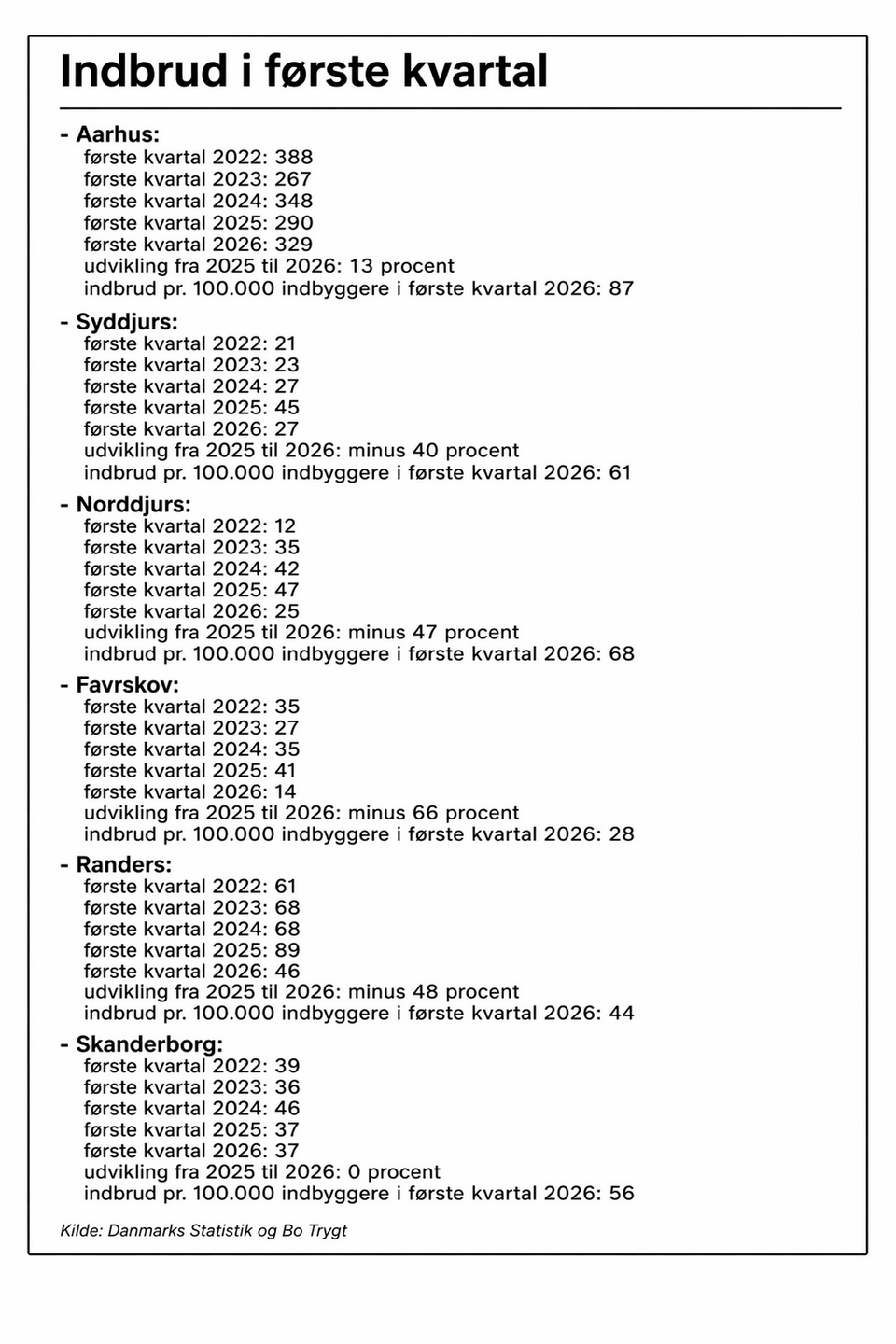 Men modsat den negative udvikling på landsplan har man i flere østjyske kommuner oplevet en positiv af slagsen – især i Favrskov, Norddjurs, Randers og Syddjurs kommuner har man oplevet markant færre indbrud i 1. kvartal i år end i samme periode sidste år.