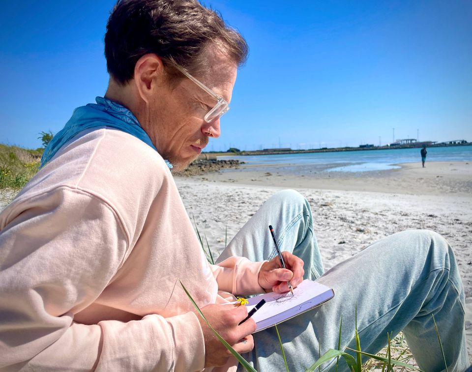 »I praksis starter jeg ofte med linjer som løse blyantstreger, arbejder lag-på-lag som i akvarel og skaber teksturer inspireret af penselteknik,« fortæller han.
