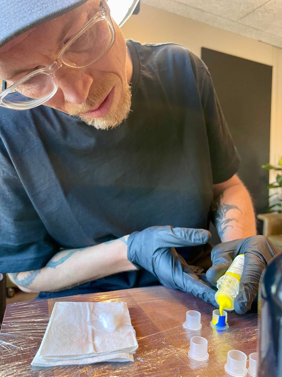 »Der bliver live-tatovering, vinyler på anlægget, kolde drikkevarer og sommervibes,« siger han lokkende, mens han blander den grønne farve.