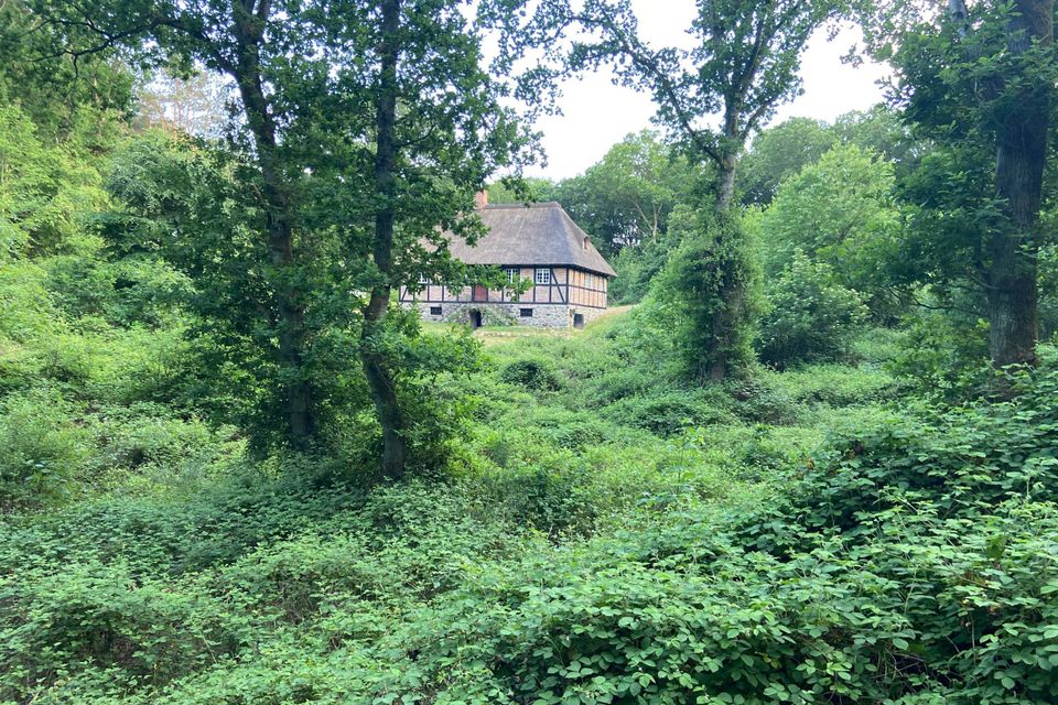 Sommerhuset er en pryd for øjet. Det er som at stige lige lukt ind i et eventyr, når det pludselig står gemt bag grønne træer. Interiøret er bevaret.