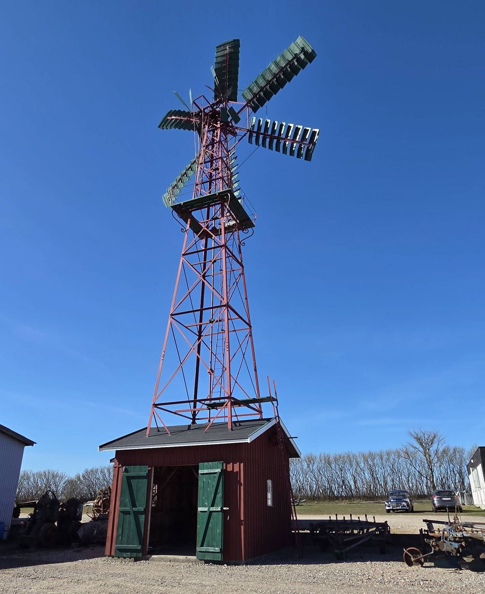 Den gamle vindmølle står som et pejlemærke udenfor motor- og maskinsamlingen. Den har drevet tærskeværk og kværn på en landbrugsejendom og har også forsynet gården med el. Foto: Anette Bonde.