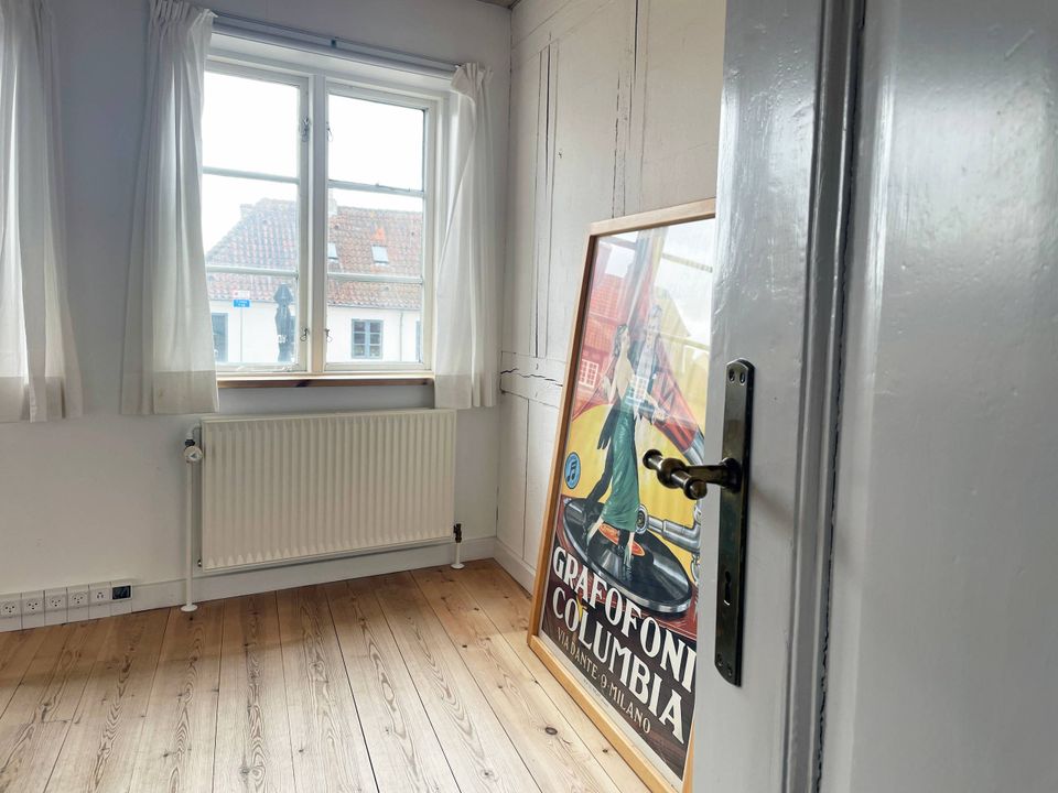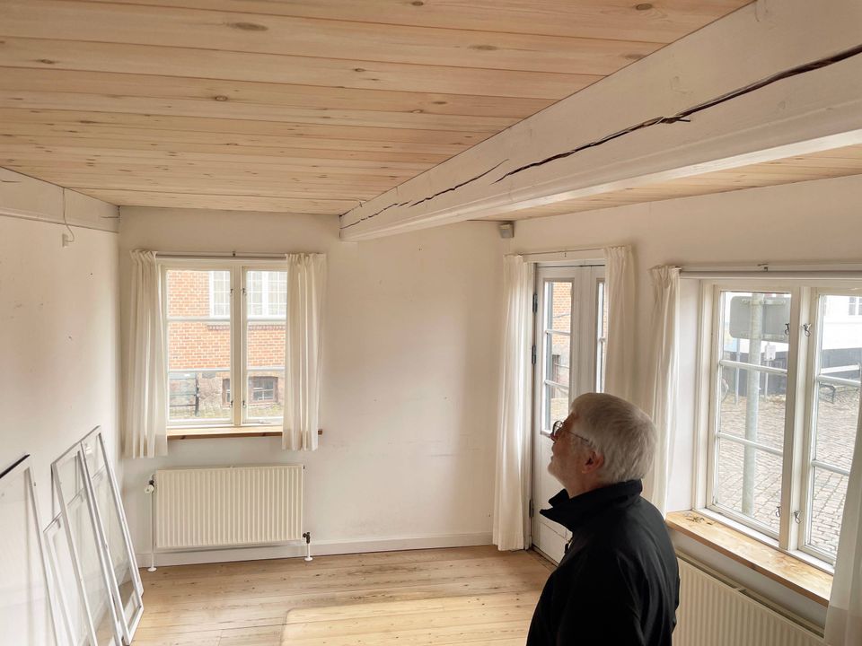 Han viser rundt på de 107 fredede kvadratmeter, hvor alt er renoveret eller udskiftet i respekt for de gamle detaljer i bygningen, der oprindelig har været to huse der er bygget sammen. Det kan blandt andet ses på størrelsen af vinduerne langs torvet. Dem tættest på hjørnet er højere end vinduerne tættest på Tinghuset.