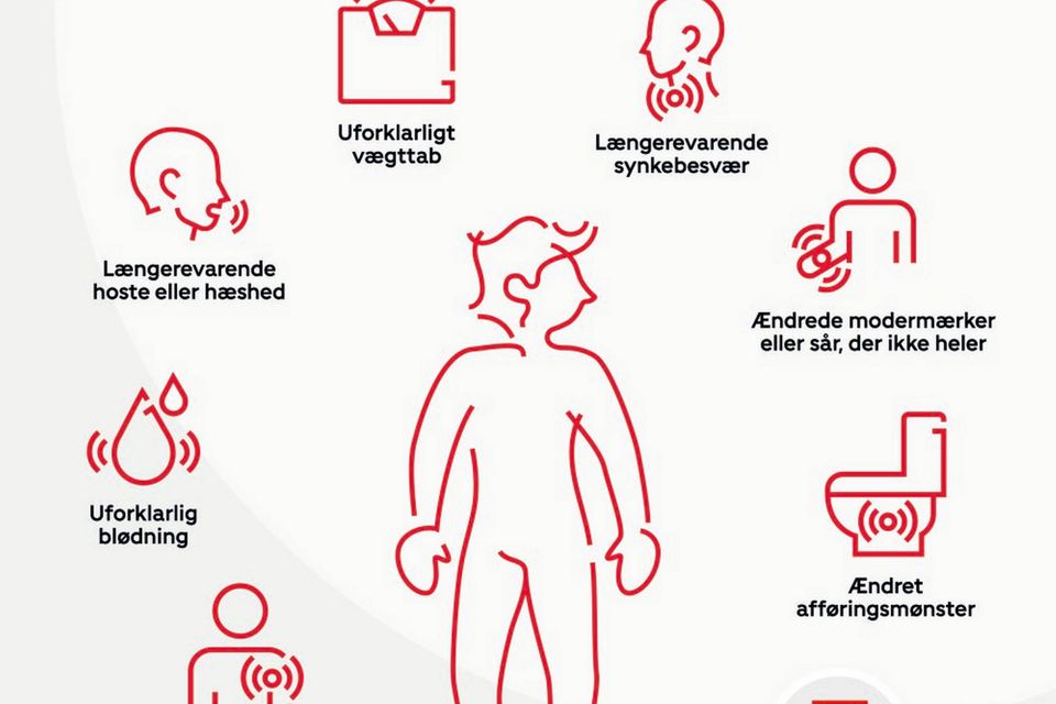 Hvis man oplever uforklarlige blødninger, nye knuder, modermærker, der ændrer sig eller sår, der ikke heler, skal man kontakte læge med det samme. Sådan lyder den klare anbefaling fra Kræftens Bekæmpelse.