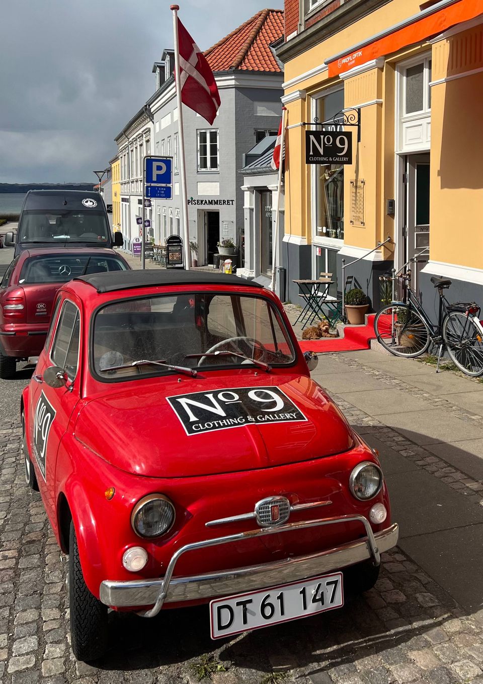 Sådan siger ejer af tøjbutik og galleri No. 9 i Jernbanegade, Karina Glerup Busk, om den lille røde bil, hun har parkeret foran butikken.