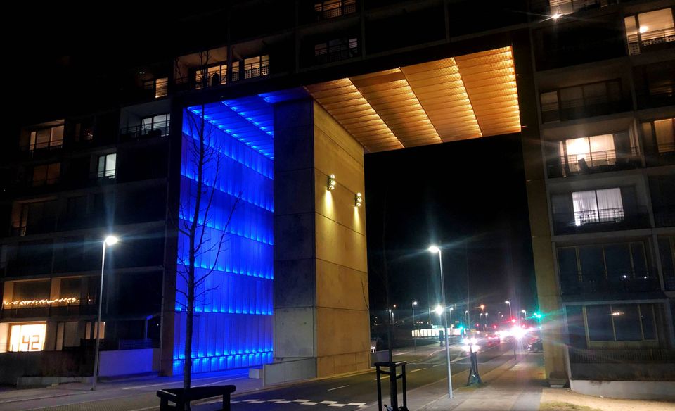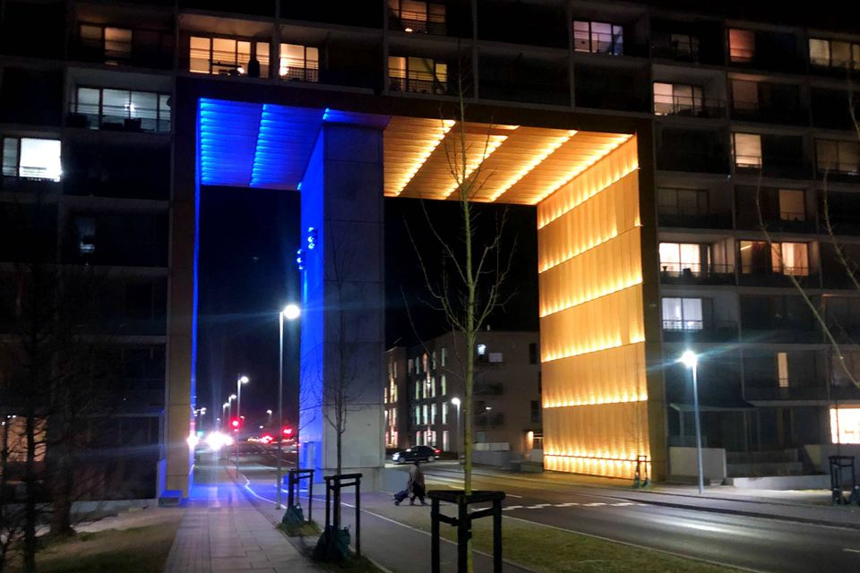 Den 28. februar i år lyste byporten, der byder beboere og gæster velkommen til Gellerup, op i gule og blå farver i sympati med Ukraine.