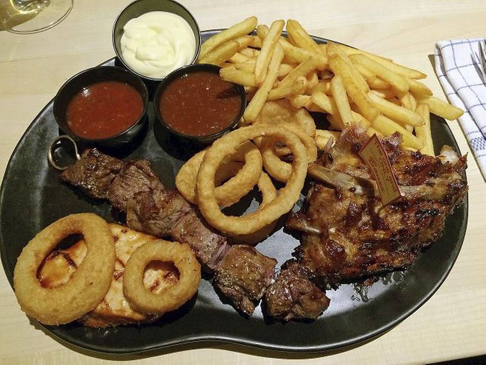 Min hustru Helle bestilte ribeye steak på 300 gram med pommes frites og en gang salatbar. Jeg selv bestilte en Route 66, der er et herligt sammenskudsgilde med grillspyd, ribs, et stykke barbecue kylling, fritter og løgringe. Dertil lidt ekstra dyppelse og en stor fadøl til hver af de voksne.