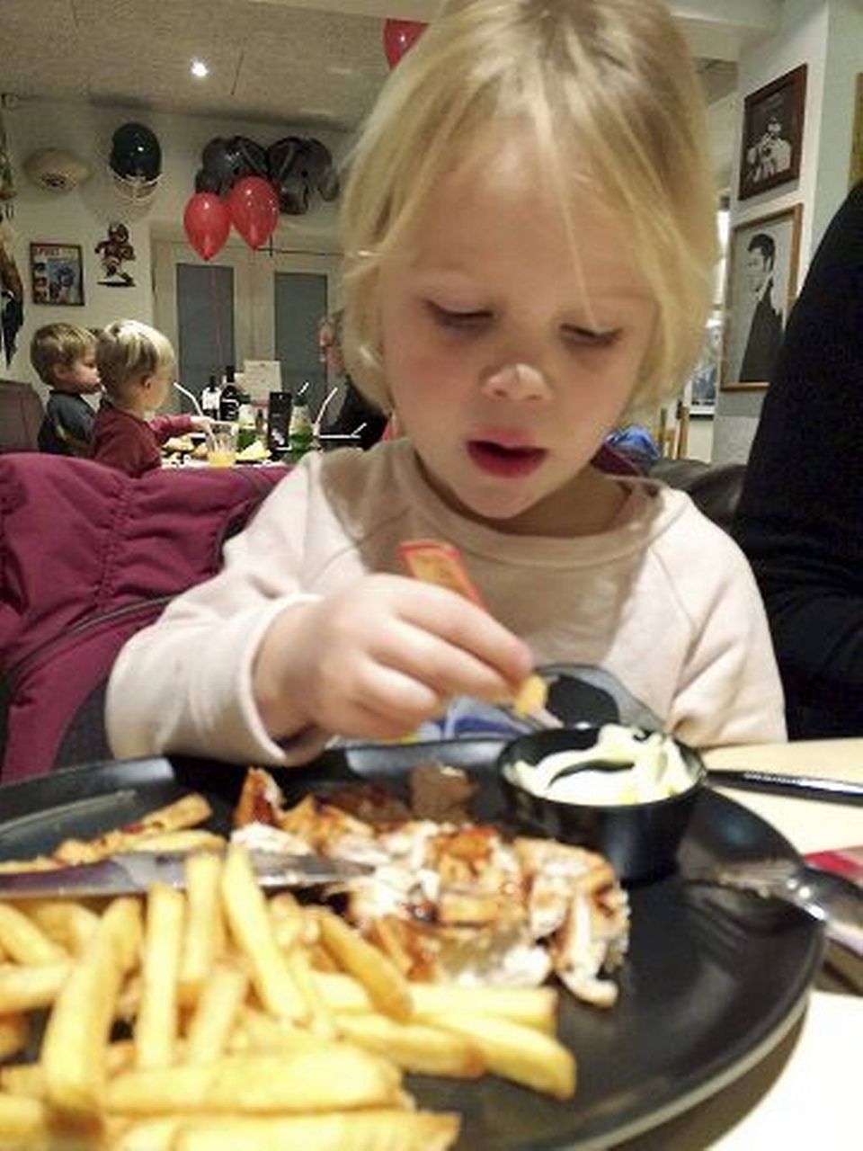 To af pigerne, Sofie og Leah, bestilte en junior pizza med skinke og dertil pommes frites. Den mindste pige Clara Filuca ville have junior barbecue kylling med fritter og knægten, Noah, skulle have en junior bøf med fritter og salatbar.