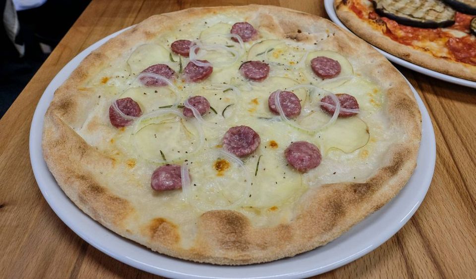 Nummer 11 er ny. Eller vi har ikke smagt den før. Patata til 85 kroner. Kartofler er blevet moderne på pizza. En del i Aarhus og omegn har slået sig op på det. Ikke alle er lige gode til det. Derfor var jeg spændt på at smage den her, da der udover kartofler også var salsiccia, løg og rosmarin.