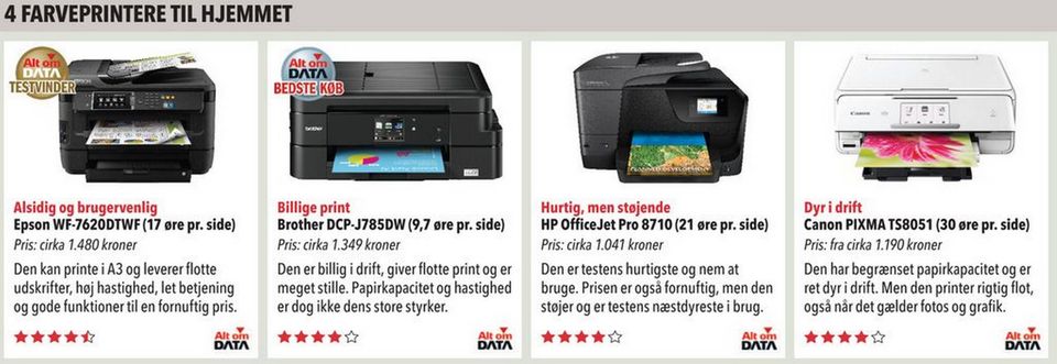 Det er lidt dyrere at udskrive på Epson, som dog bliver testvinder takket være dens alsidighed og nemme betjening. Vil du printe fotos, er Canon værd at overveje.