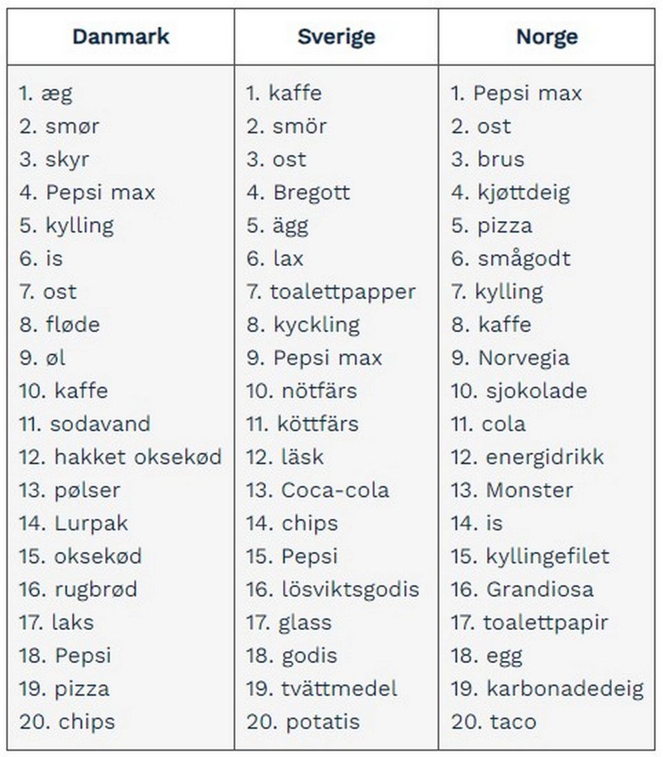 Sodavand var dog en klar topscorer med hele fire placeringer på listen: 9., 12., 13. og 15. pladsen. Svenskerne viste desuden større interesse for tilbud på kartofler og vaskemiddel end danskerne eller nordmændene.