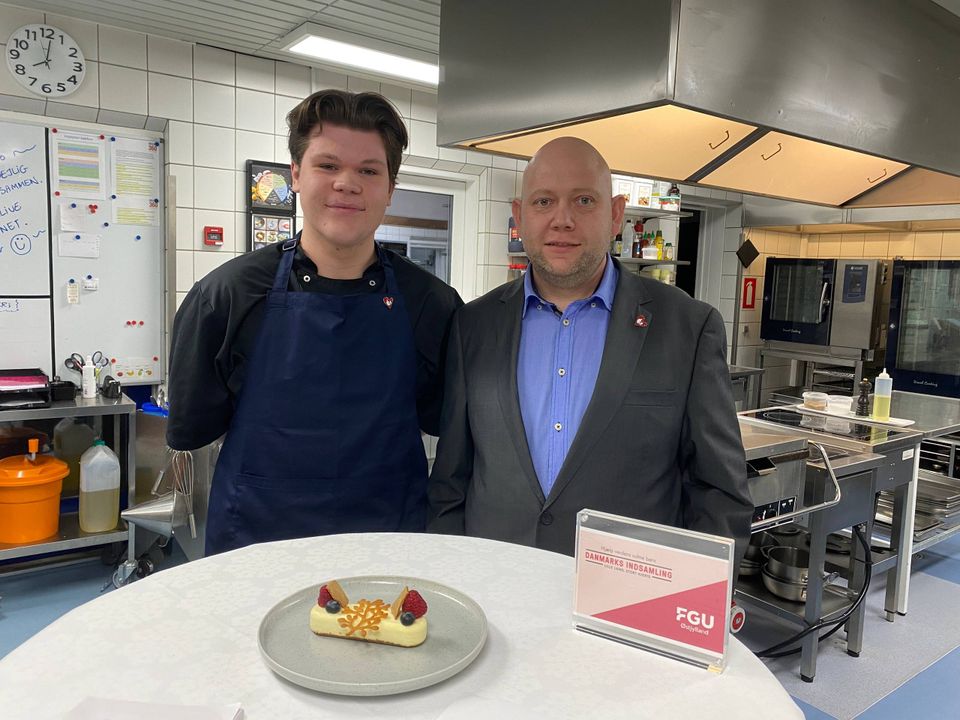 Lærling Tobias Guld og underviser Jacob Ølholm var igennem live på DR til indsamlingen 2024. Her fik de lov at præsentere desserten og dele det flotte resultat. Foto: FGU Østjylland