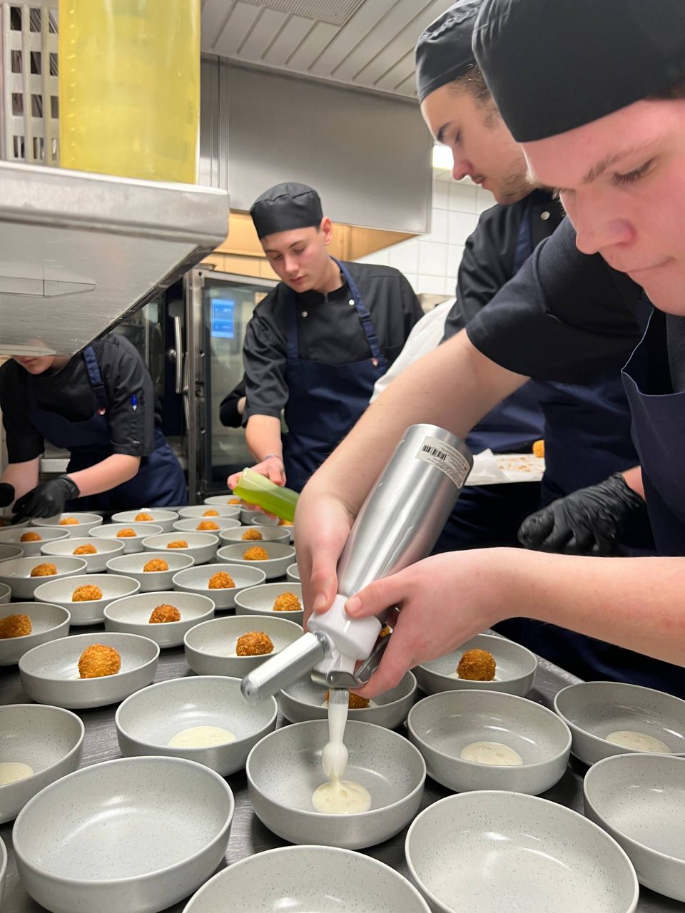 Eleverne i køkkenet anrettede appetizere sidste år og oplevede presset, når alt skulle spille i et køkken og i et samarbejde med tjenerne. Det gør de igen 25. januar. Foto: FGU Østjylland