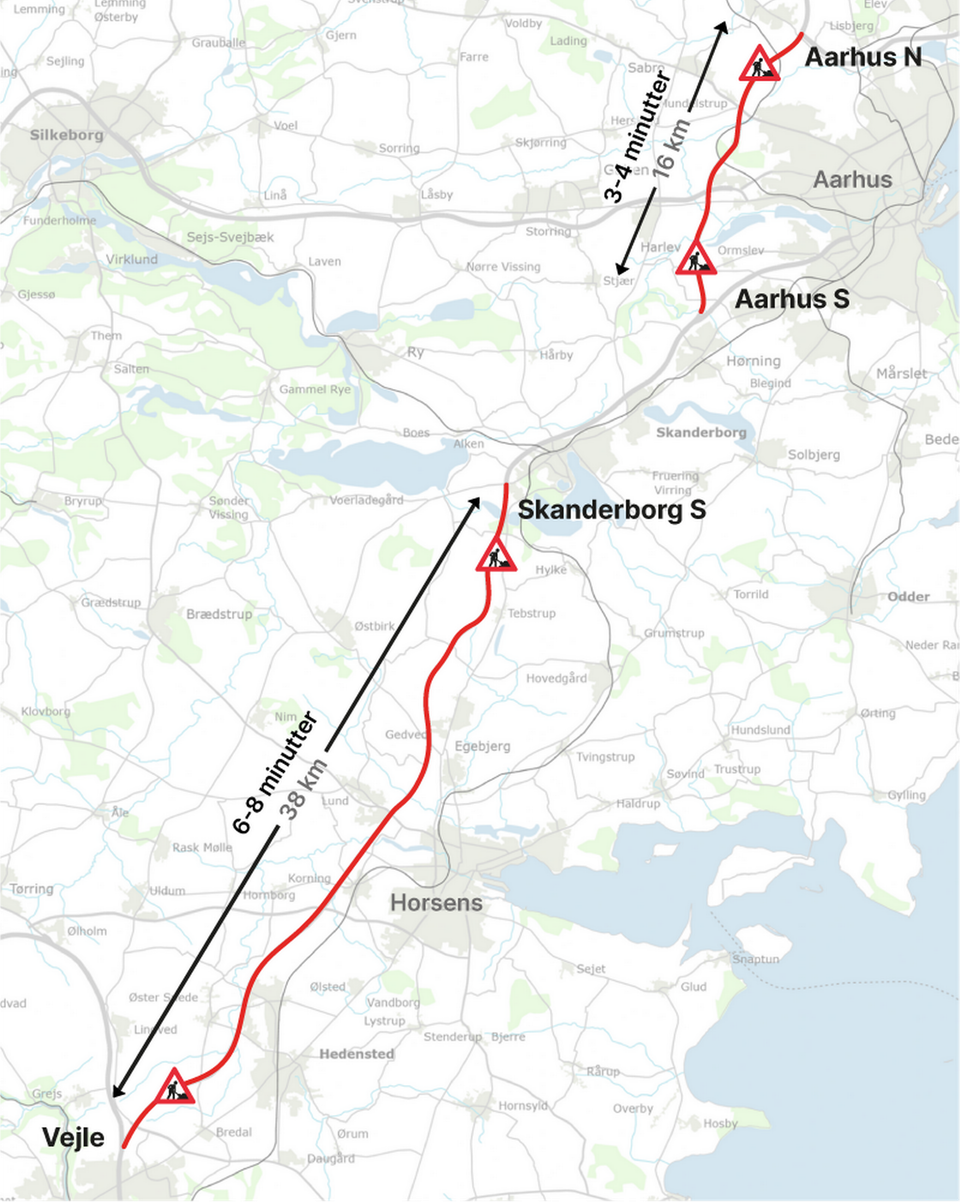 Begiver man sig ud på en køretur hele vejen mellem Vejle og Aarhus N, ser det lidt anderledes ud med rejsetiden.