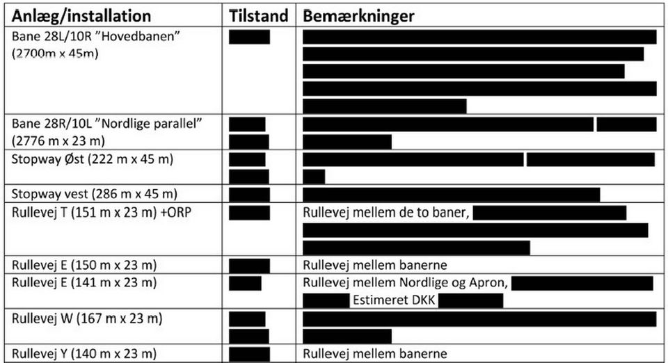 Inden lufthavnen og Forsvaret indgik købsaftalen, blev der lavet en tilstandsvurderingsrapport på anlæg og installationer. Avisen har fået aktindsigt i denne, men enhver angivelse af tilstand og bemærkninger om, hvornår der påregnes en udgift og den forventede størrelse på udgiften, er blevet overstreget.