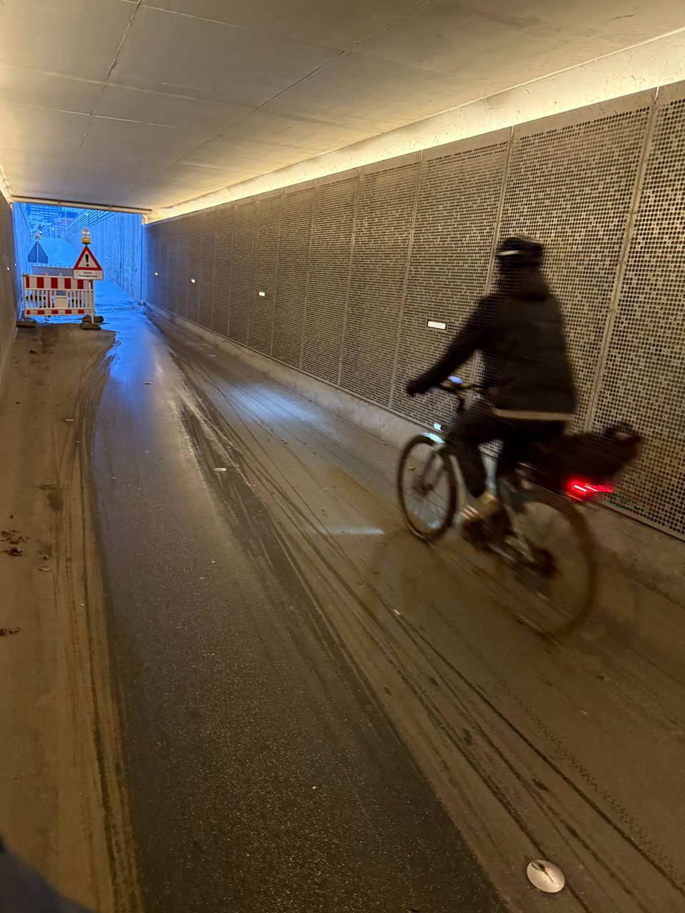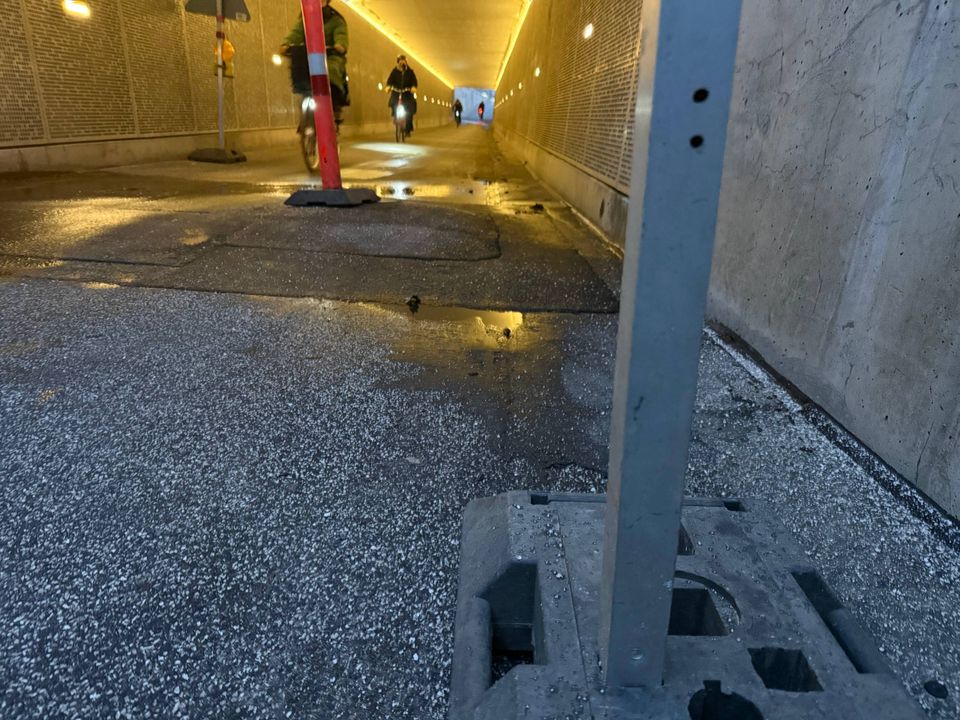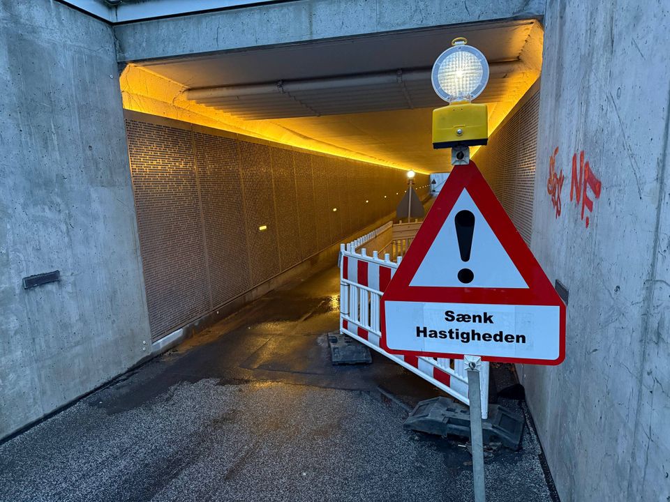 »Bump på kørebanen« og »sænk hastigheden«, lyder advarselsskiltene i hver sin ende af tunnelen. Og i den ene ende – den tættest på Havnepladsen – er det ene cykelspor spærret af.