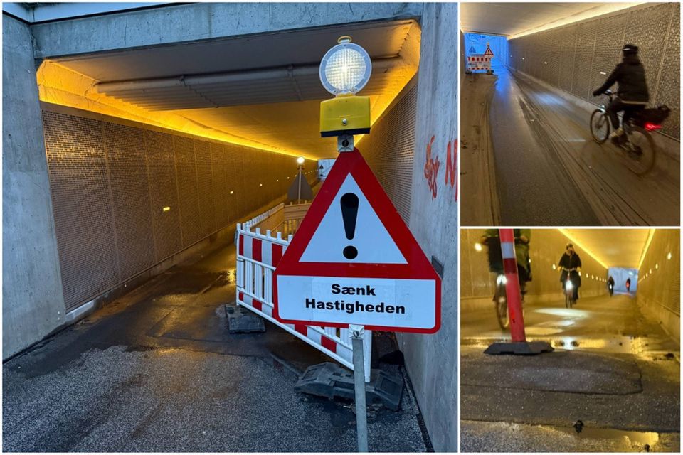 Kommunen skal igen-igen udbedre en skade på cykeltunnelen under Nørreport-krydset i det centrale Aarhus. Men kulden kan komme til at udskyde arbejdet: »Det er selvfølgelig utroligt meget til gene for den trafik, der er, og det er jo farligt at køre på,« lyder det fra kommunens driftsingeniør, der vil have skaden ordnet hurtigst muligt.