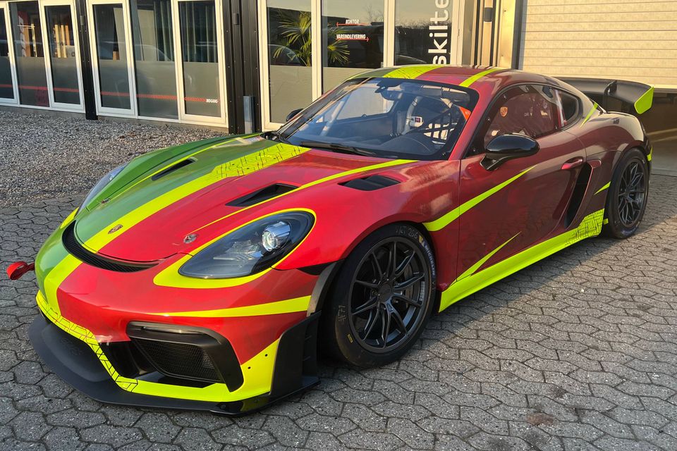 Dekorationen af FM Racings nye Porsche 718 GT4 er på plads. Den ene halvdel består af den grønne farve fra Frank Laursens Legend-racer. Den anden halvdel er fra den røde farve fra Mikkel Rybergs Legend-racer.